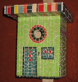 Dit vogelhuis hangt bij mij achter in de tuin en is een blikvanger voor de vogeltjes in het voorjaar. Kleuren: alle kleuren van de regenboog. Het is met grijs gevoegd. Techniek: mozaïektegels in repen ingelegd. Formaat: 15 x 26 x 15 cm (lx h x b). Periode: april 2008. | |