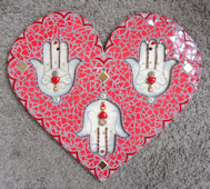 De handen van Fatima zijn vergelijkbare kunstwerken, maar van dichtbij bekeken ook weer zeer verschillend. Kleuren: Diverse kleuren, van beige, (room)wit, Marokkaans blauw, lichtblauw, donkerblauw, kleuren oranje, appeltjesgroen, roze etc. Techniek: Mozaïek in combinatie met 'tegen het boze oog', zilveren kralen en catseyes. Formaat: 33 x 33 cm (h x b). Periode: oktober 2015 en juni 2017. | |