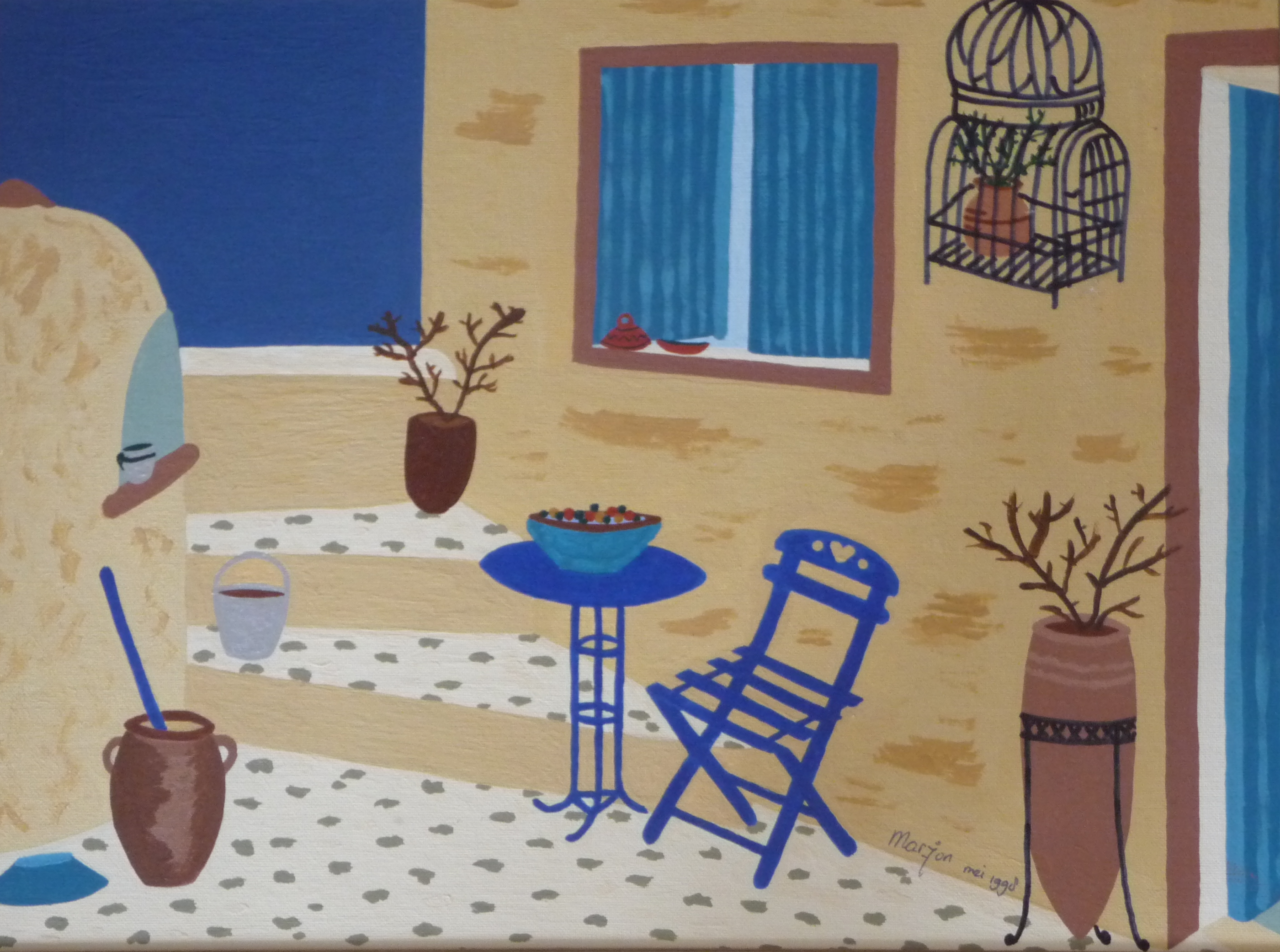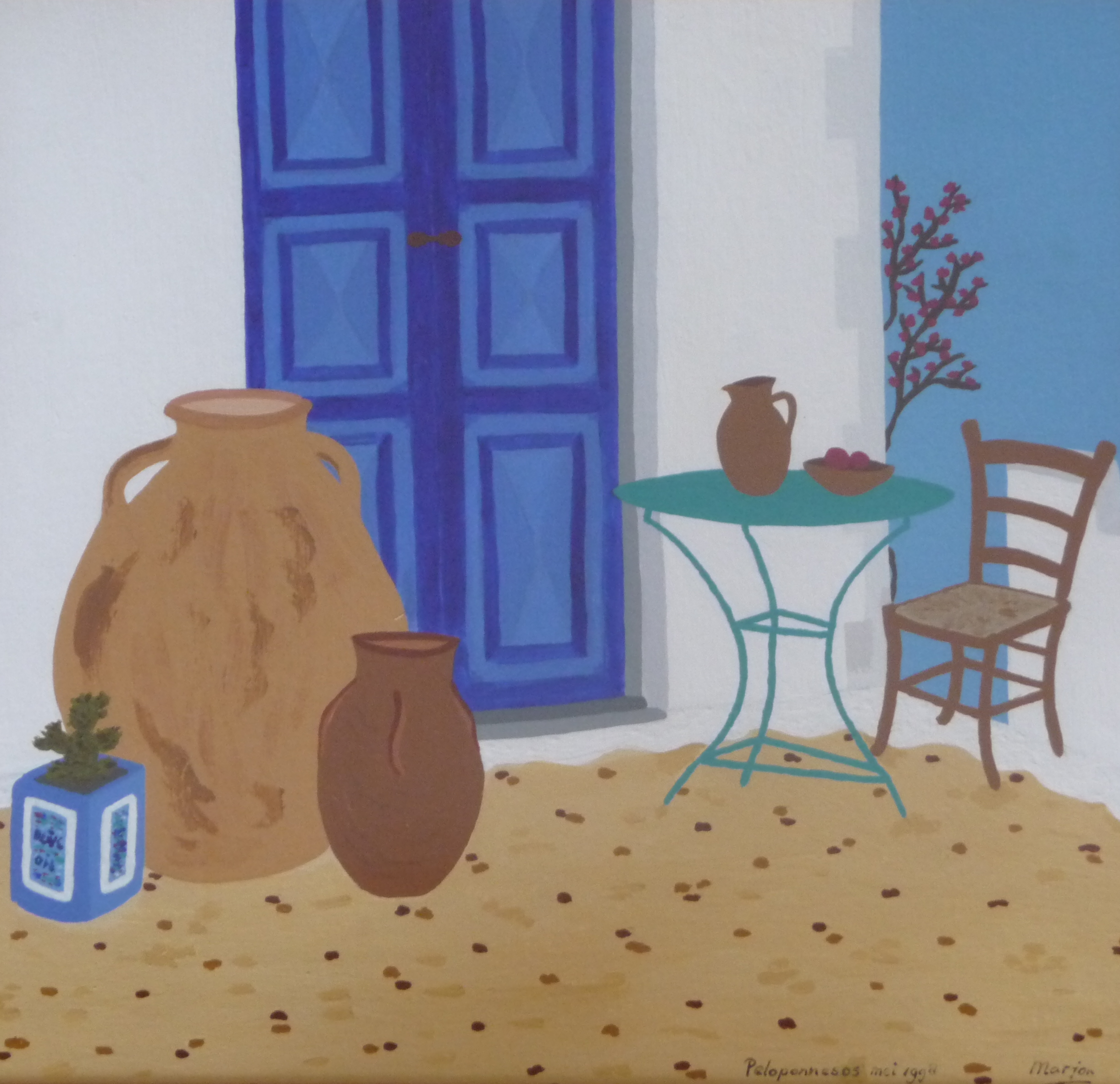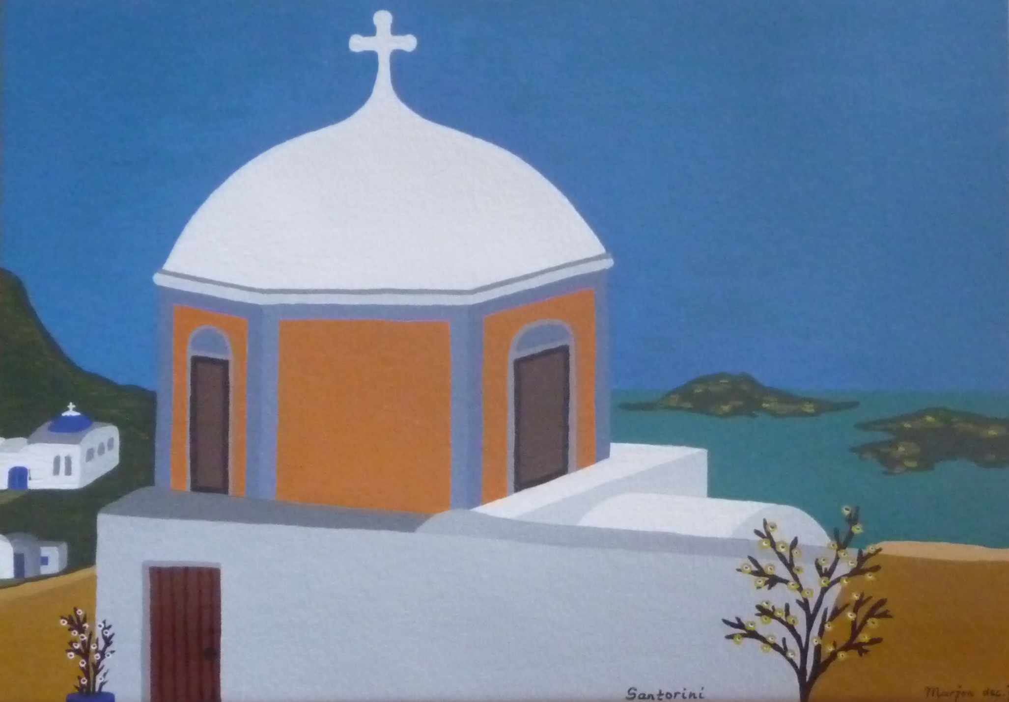 Op deze beide schilderijen ziet u een zomers tafereeltje op de daken van een echt Cycladenhuisje op het eiland Santorini. De plek nodigt uit om eens heerlijk over mooie momenten te mijmeren en over de zee uit te kijken. Dit plekje is een fantasieplaatje van de omgeving van Imerovigli of Firostefani. |