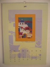 Mijn werken op kunstkalenders. Links ziet u de maand juli van de kunstkalender voor het jaar 2001 (Oia/Santorini) en rechts van een andere kunstkalender, augustus 2002 (Lindos/Rhodos). |