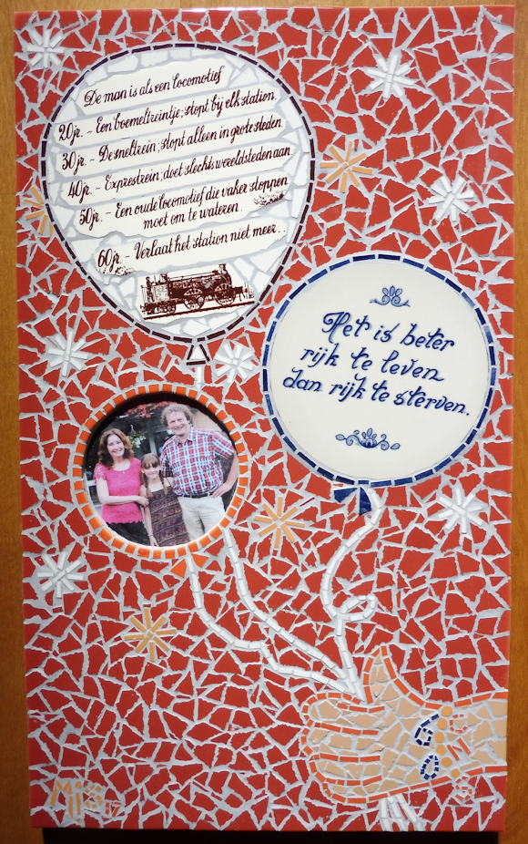 Een speciaal mozaïekwerk ter gelegenheid van de verjaardag van Cees die 60 jaar geworden is. In de balonnen zijn bijzondere spreuken verwerkt.