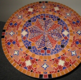 Dit tafelblad - voor binnen, zonder onderstel - is ingelegd met diverse soorten mozaïekstukjes, die ook verschillende hoogten hebben, waardoor er een hele apart uitstraling is ontstaan. Er is als het ware een rand binnen het tafelblad gecreëerd. De stertafel is geïnspireerd op het heelal. Kleuren: Twee kleuren blauw, terra, zandgeel, zwart, wit en een gemixte tegel (8 vlakken binnen de ster), tevens zijn er witte sterren en witte met een blauwe randje toegevoegd. Techniek: Mozaïekstukjes op een geraffineerde manier gecombineerd. Formaat: 60 cm (doorsnee). Periode: februari 2005. | |